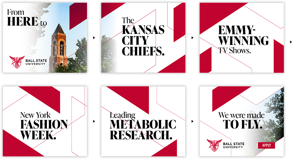Solution: Establish a new brand strategy to help We Fly to work even better, connect faster and in bolder ways with prospects, while showcasing BSU’s power to set up students for great success. We took Ball State’s brand from largely institutionally focused to a more student support focus. We leveraged its success stories by weaving in powerful people stories and colorful details to illustrate what We Fly means at BSU. A new design approach, bolstered by more graphic treatments and an abstract treatment of the University’s wing detail, brought new energy and big movement to the visual identity. The newly evolved brand strategy amplified outcomes, introduced new graphic elements and motion, and gave the brand the powerful relaunch and boost it craved.