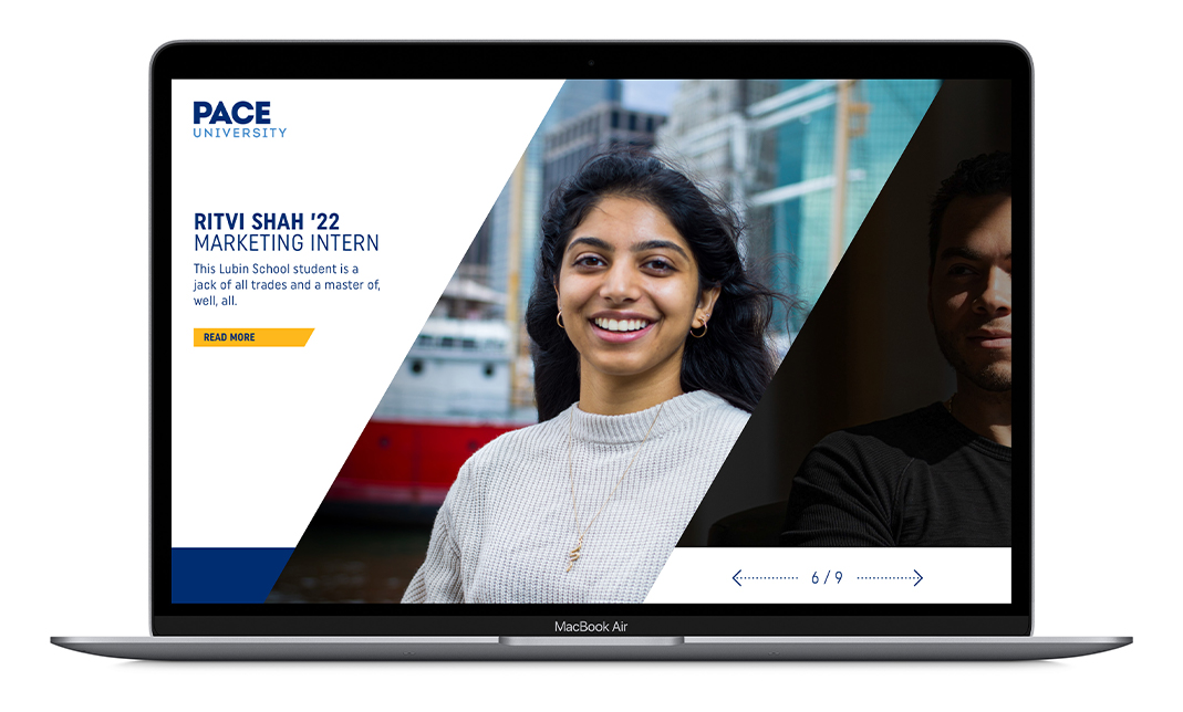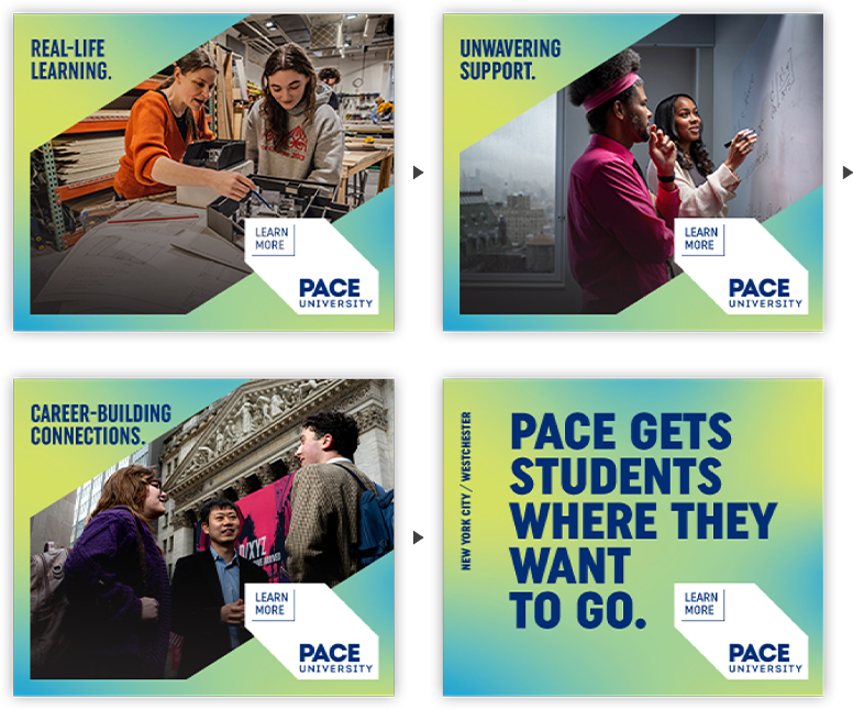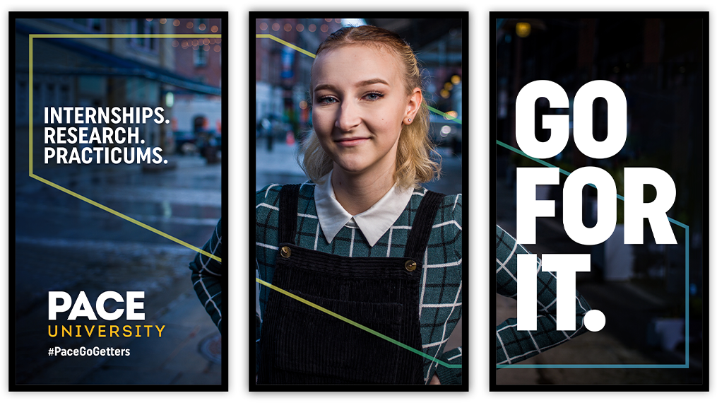 Solution: A sharpened message celebrating undeniable outcomes, a refreshed look, and new photography came together to create the updated Pace University brand campaign creative that would make clear, although it might not be the only game in town, Pace is a New York original.
